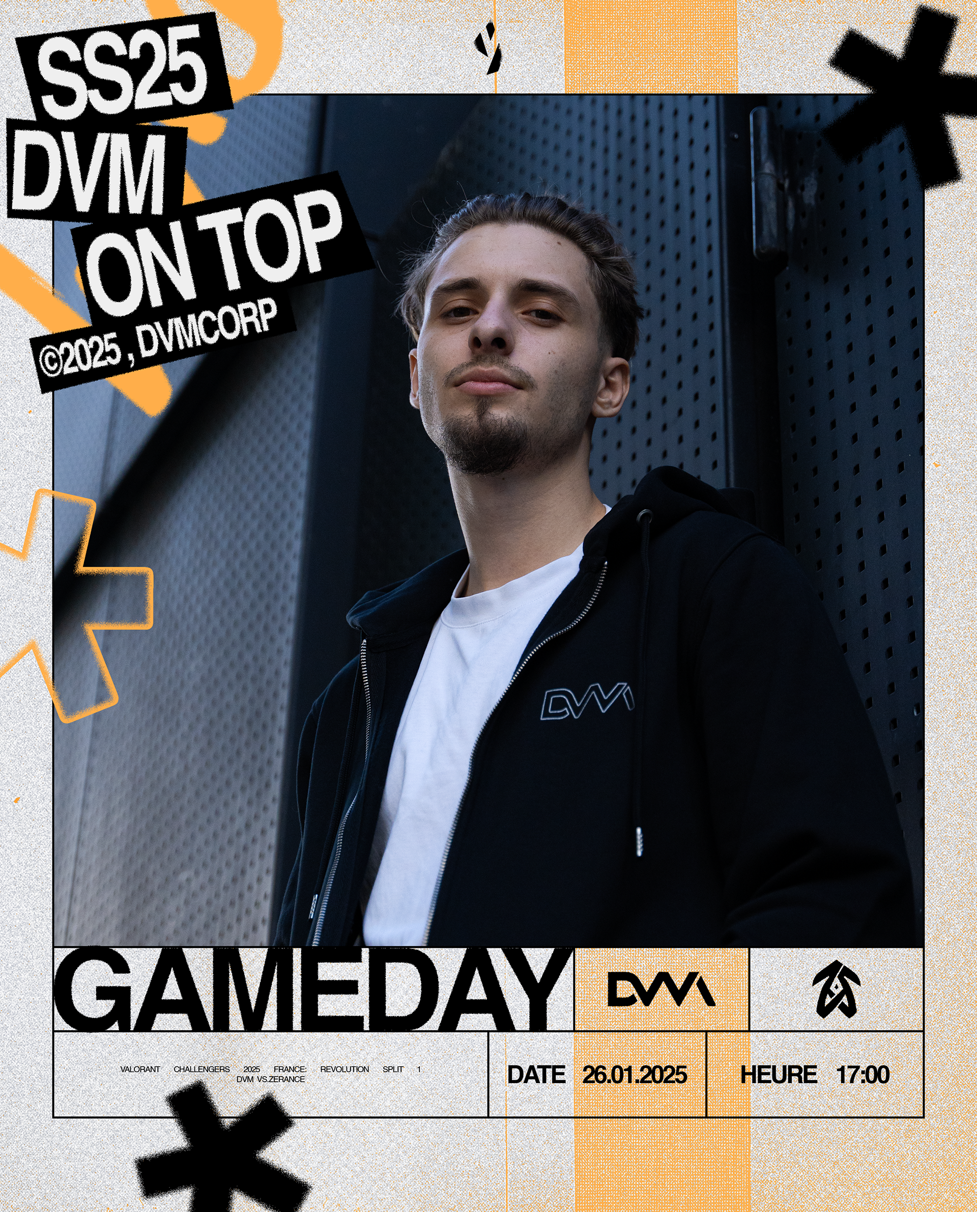 Nous avons créé un univers graphique impactant qui reflète parfaitement l'univers de DVM Esport, qui inclut : identité graphique sur les réseaux sociaux, affiches de match, de victoire, de défaite et plein d'autres éléments retrouvables sur les différents contenus de DVM.