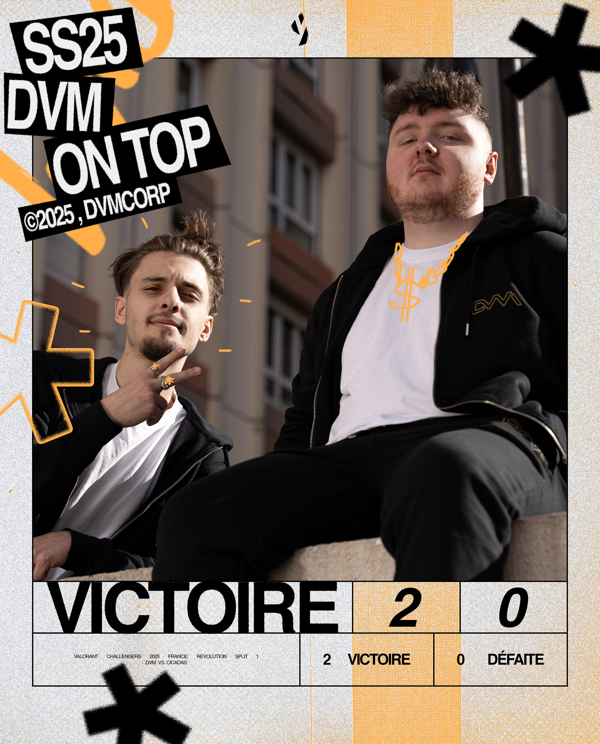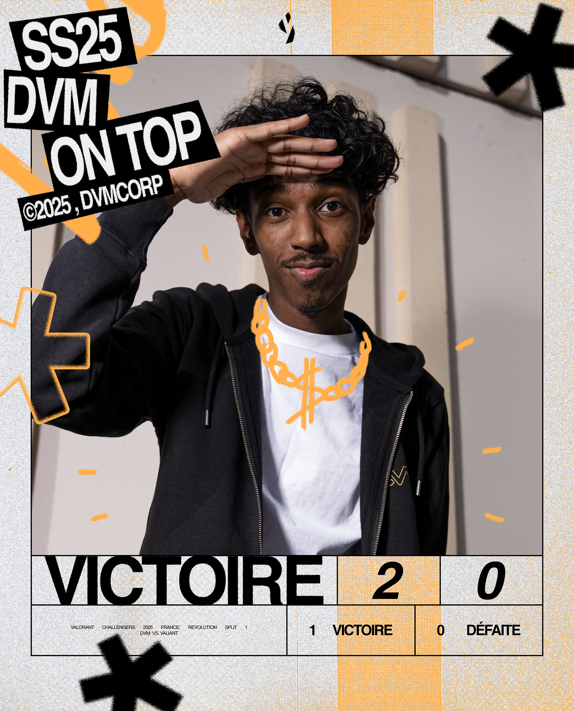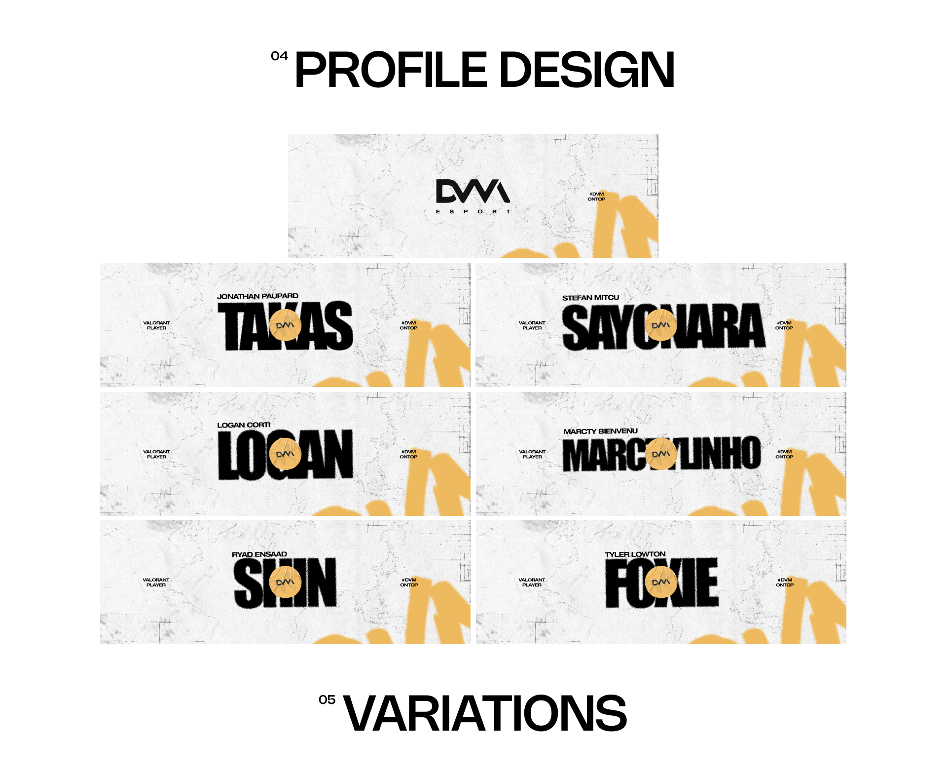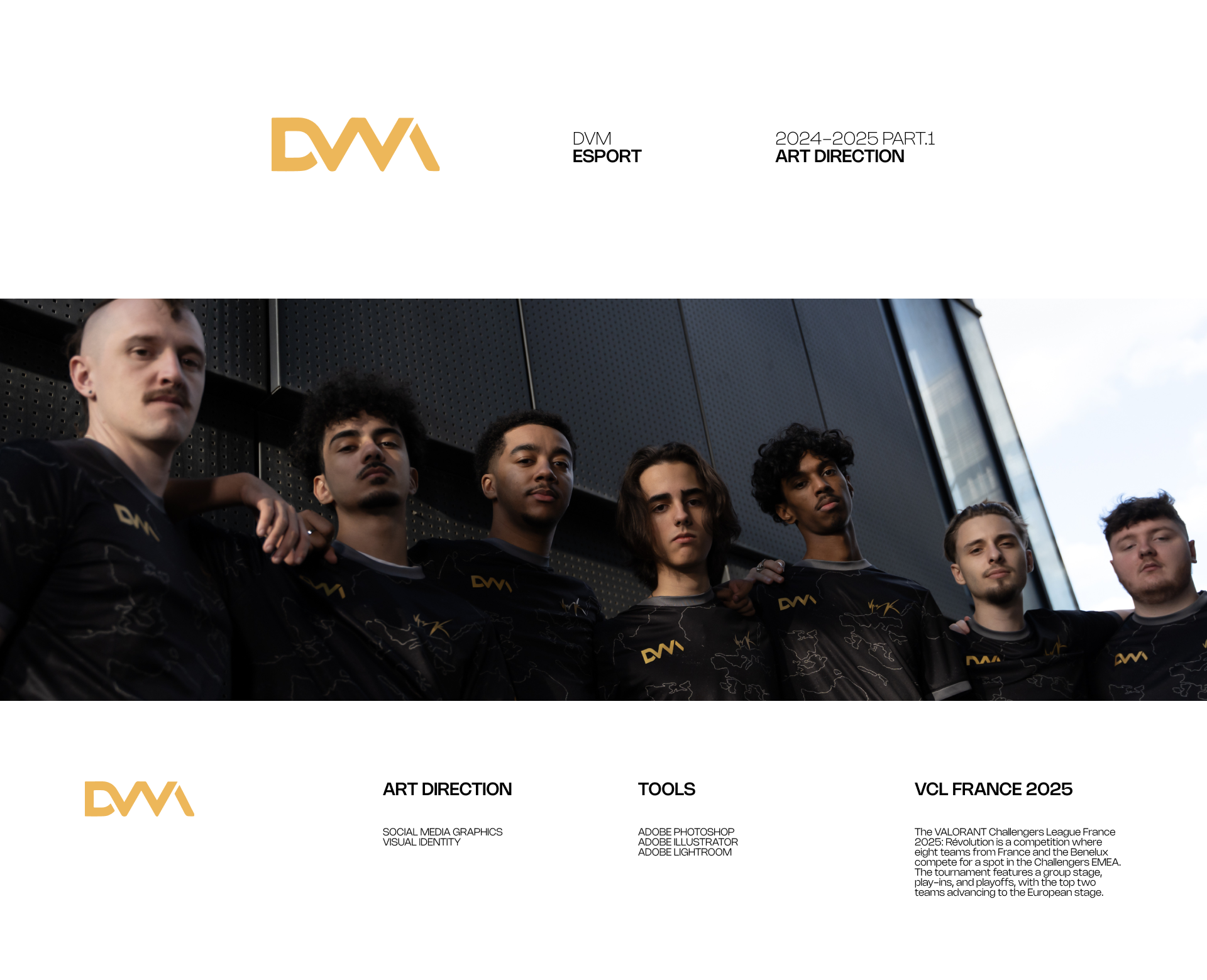 Nous avons créé un univers graphique impactant qui reflète parfaitement l'univers de DVM Esport, qui inclut : identité graphique sur les réseaux sociaux, affiches de match, de victoire, de défaite et plein d'autres éléments retrouvables sur les différents contenus de DVM.